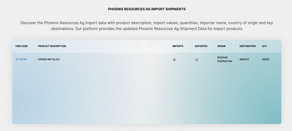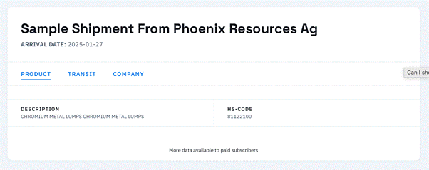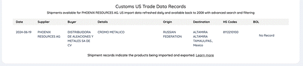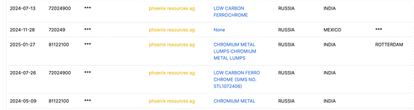 Since 2024, Phoenix Resources AG has been recorded shipping low-carbon ferrochrome and metallic chromium to Mexico, with importers including Distribuidora de Aleaciones y Metal S.A. de C.V. and Aso Alloy de Mexico. This pattern highlights a Latin American corridor that frequently serves as a gateway to the US.